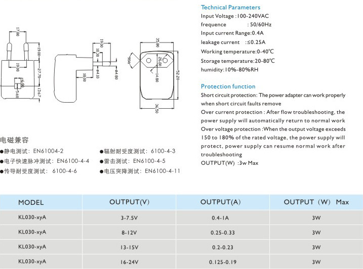 頻率:50/60Hz 輸入電流:0.4A 漏電電流:≤0.25A 工作溫度:0-40℃ 貯藏溫度:-20-80℃ 濕度:10%-80%RH 短路保護(hù): 電源適配器在短路解除時(shí)能正常工作恢復(fù) 過流保護(hù):過流故障排除后,電源將自動(dòng)恢復(fù)正常工作 過壓保護(hù):當(dāng)輸出電壓超過額定電壓的150-180%時(shí),電源將保護(hù),故障排除后電源能恢復(fù)正常工作" />